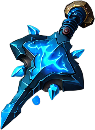 一把充满活力、威力十足的双手剑。宽阔的剑身仿佛带着静电般噼啪作响,闪烁着淡淡的蓝色闪电图案。剑柄坚固耐用,由深色旋涡状木材制成,并包裹着结实的蓝色布料。护手设计有棱角分明的空气动力学翼片,中央镶嵌着一个小小的发光球体(“眼睛”)。图标背景是一片狂风暴雨的天空,远处闪电划过。灯光效果绚丽夺目,锐利的蓝色闪光照亮了剑身。