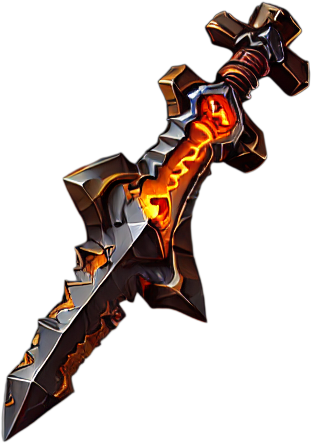 一把巨大的双手剑,剑身漆黑裂开,剑身内部闪烁着橙红色的熔岩纹路。剑柄由粗糙的黑色铁锻造而成,外层包裹着厚实的耐热皮革。护手呈不对称锯齿状,形似硬化的熔岩。图标背景是一片烟雾缭绕的火山景观,余烬漂浮其中。灯光强烈而炽热,投射出橙色的光芒和深邃的阴影,凸显了剑的高温和重量。