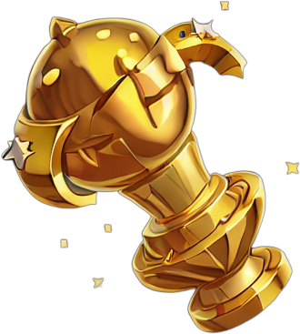 一个Q版卡通风格的奖杯,主体是一个超大的、夸张的金色游戏手柄,手柄中央有一个微笑着的Q版胜利表情。手柄周围飘着彩带和金色的星星。整体造型应圆润、可爱,色彩饱和度高。要求矢量风格或高光卡通渲染,适合作为休闲或成就系统图标。完全去除背景,突出其趣味性和易识别性。